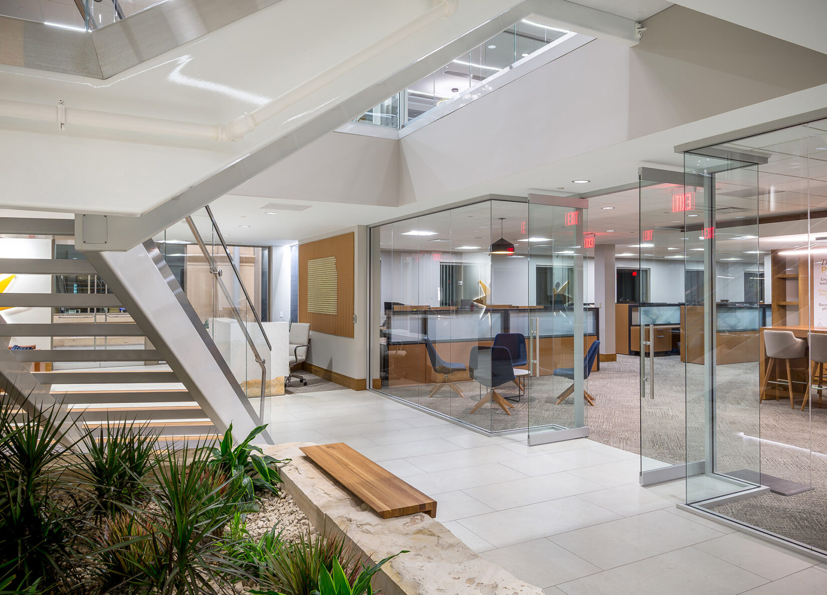 The project included constructing a new atrium entrance with distinct wayfinding, creating updated incubation areas for strategic partners, and redesigning the interior to increase natural light and foster a more welcoming atmosphere. A heavy solid oak staircase was replaced by an open concept monumental staircase with glass handrail. Limestone authentic to Kansas was used as seating elements and accents throughout the building and vestibule to enhance the “Kansas” feeling. The reception desk was accented with a waterfall edge solid surface top with a profile of the Kansas River cut into the free edge. In the new breakroom, a 12-foot live edge table appears to float around an existing column. Two hospitality bars provide refreshments for staff and guests. New sitting areas in the vestibule and courtyard offer breakout spaces for conference attendees and staff.